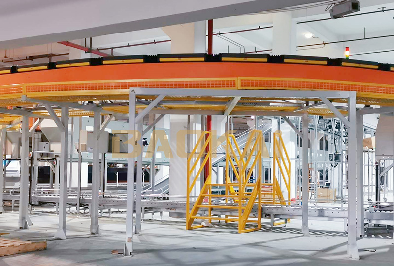 鞋服类大型项目,集成螺旋机,通道机,交叉带分拣机,提升机等智能设备和宝开BICS信息管理系统,通道机效率达420箱/小时,分拣效率达8000-10000件/小时。